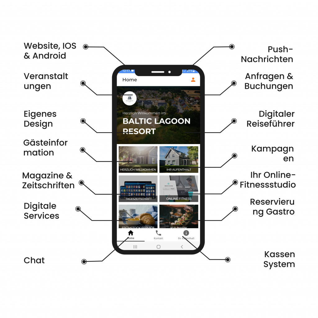 Nach einer umfassenden Bedarfsermittlung entwickeln wir Ihr individuelles Betreuungssystem – als App oder als Ergänzung zu Ihrem bestehenden System. Ihr eigenes Online-Fitnessstudio mit Logo und Live Kursen, ein digitaler Lesezirkel mit 7.000 Magazinen, Einkaufsservices und viele weitere nützliche Features stehen Ihnen zur Verfügung. So bieten Sie Ihren Gästen innovative und personalisierte Services, die begeistern.